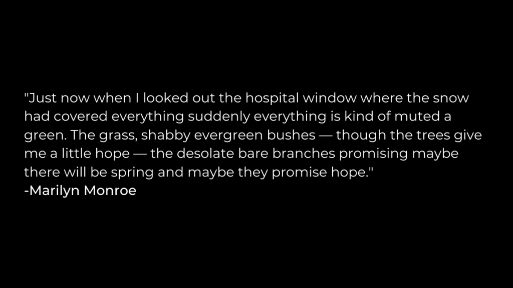 Previous ImageNext Image Just now when I looked out the hospital window where the snow had covered everything suddenly everything is kind of muted a green. The grass, shabby evergreen bushes — though the trees give me a little hope — the des